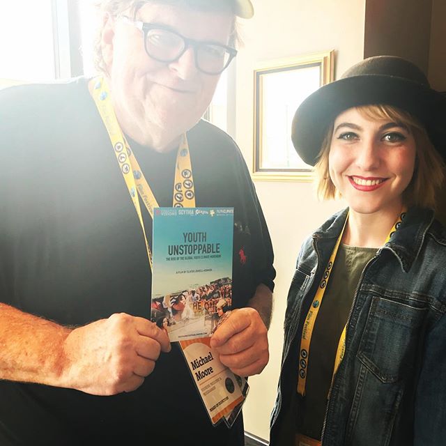 Jewell-Kemker photographed with Mike Moore at the Traverse City Film Festival. Other well known Americans have put up their hands to support Jewell-Kemker. One is Adrian Grenier, the lead actor from Entourage, who came on board as an executive producer, declaring, “Young people these days aren’t waiting. They have access to the facts on climate change, the intelligence to understand our negligence as adults, and the platform to stand up and speak out.”