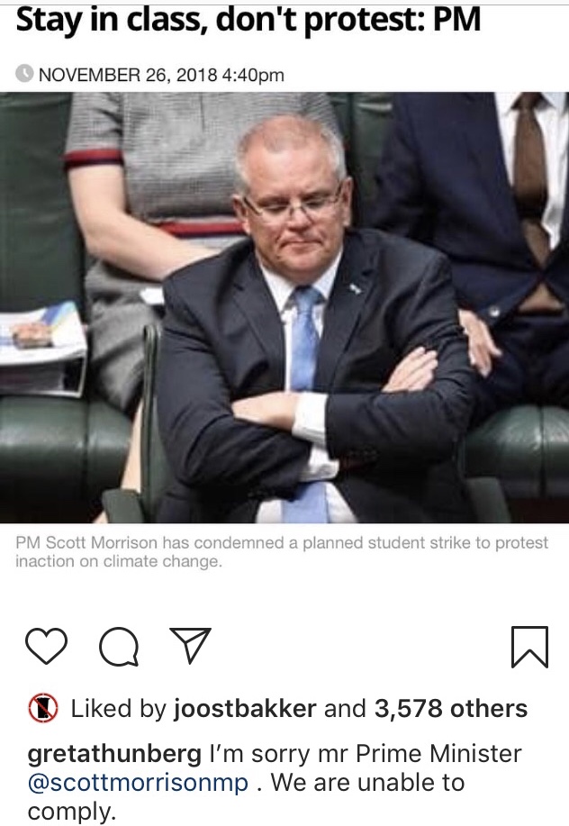 Australian readers will appreciate this post! The students commented on how pleased they were that the Prime Minister had responded, firstly because it meant he was taking notice, and secondly, that being told to stay in school just made them want to go on strike even more. Jean also mentioned that after seeing how committed the Australian students were to getting their voices heard, Greta was re-inspired to keep going.